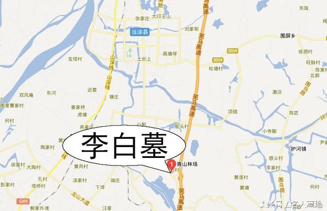李白墓相对于当涂县城的位置